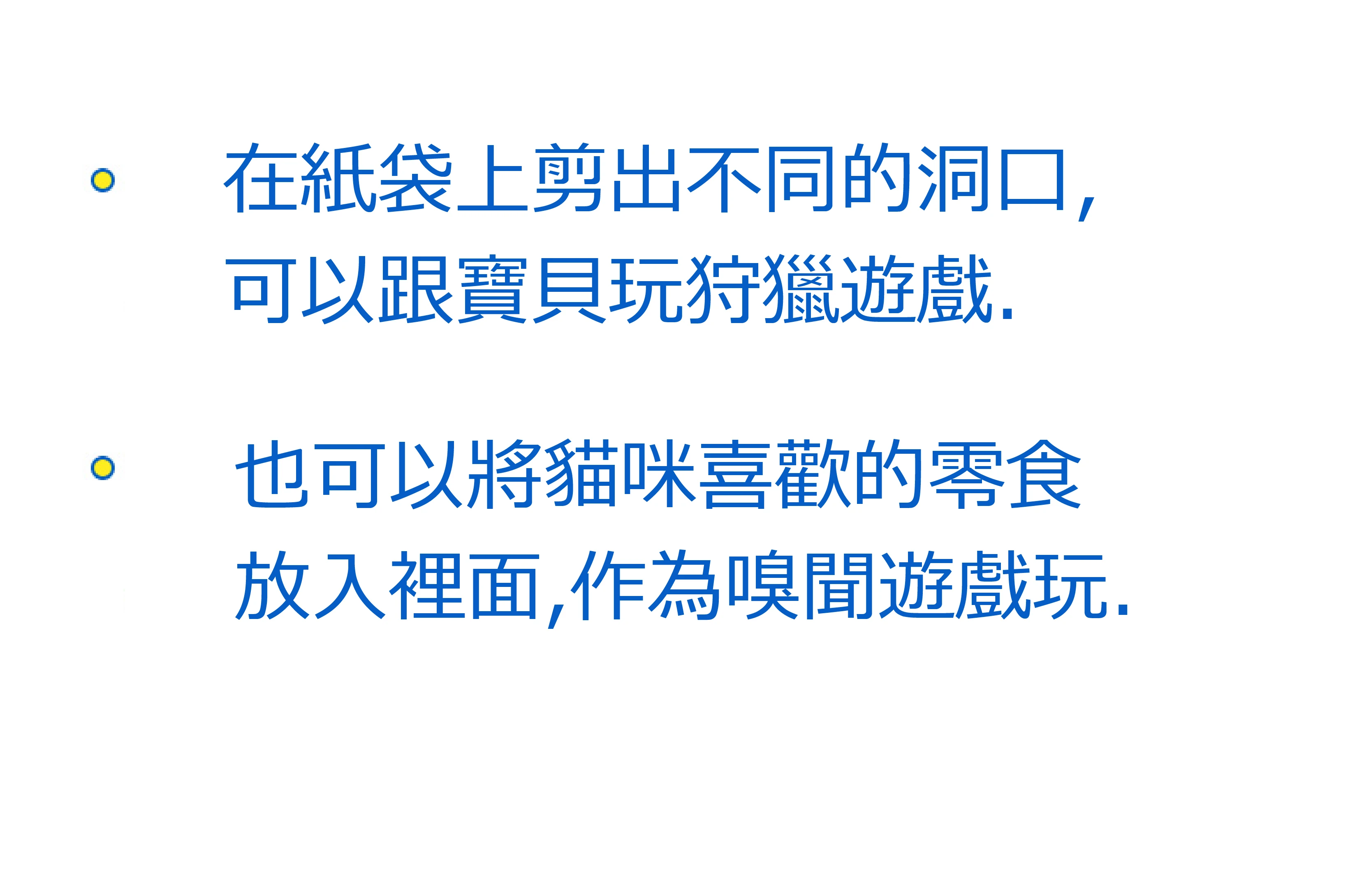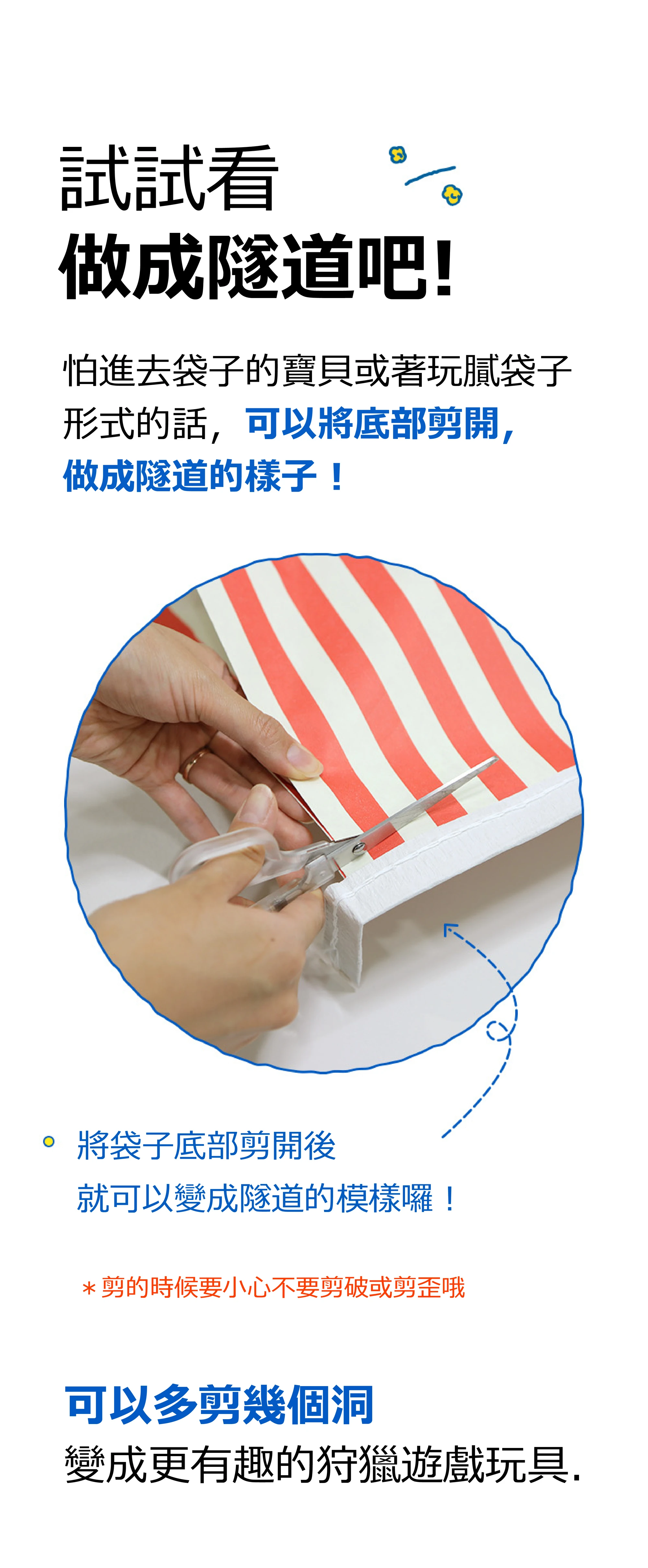 • 在紙袋上剪出不同的洞口,可以跟寶貝玩狩獵遊戲。